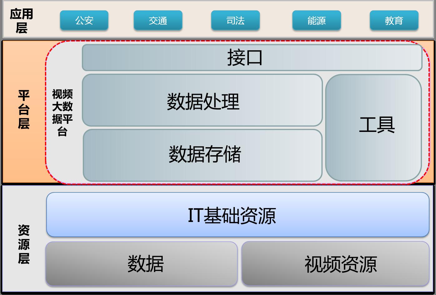 視頻大數(shù)據(jù)處理系統(tǒng),在應(yīng)對視頻大數(shù)據(jù)處理中的存儲問題,采用了分布式存儲方式,提高了讀寫速度,并擴(kuò)大了存儲容量;在應(yīng)對視頻大數(shù)據(jù)處理中的計(jì)算問題,采用分布式計(jì)算系統(tǒng),提高了數(shù)據(jù)分析和挖掘能力。視頻大數(shù)據(jù)處理系統(tǒng)總體架構(gòu)如下圖所示,包括資源層、平臺層、應(yīng)用層三個(gè)層次。