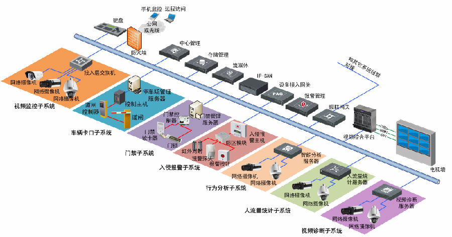 整個系統(tǒng)設(shè)計包括:視頻監(jiān)控系統(tǒng)、入侵報警系統(tǒng)、門禁管理系統(tǒng)、出入口控制系統(tǒng)、行為分析系統(tǒng)、人流量統(tǒng)計系統(tǒng)、視頻質(zhì)量診斷系統(tǒng),系統(tǒng)拓?fù)浣Y(jié)構(gòu)如下圖所示: