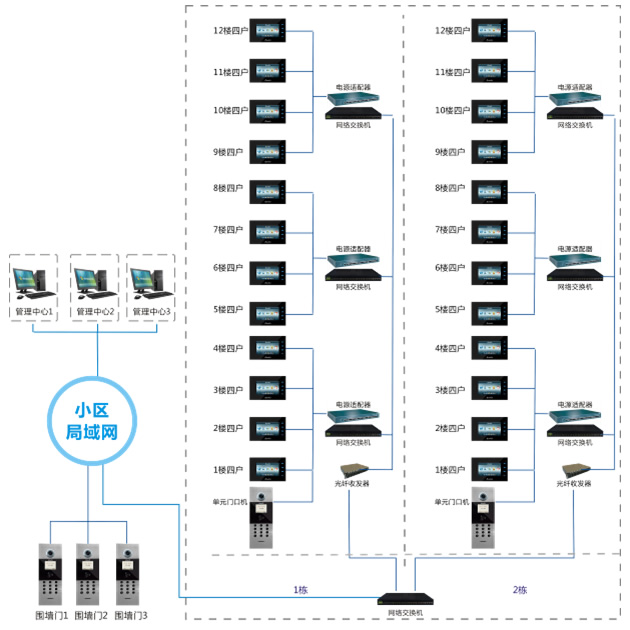 在小區(qū)門口、單元門口設置門口機,在物業(yè)管理中心設置管理軟件,各個住戶室內設置室內機,可實現以下功能: